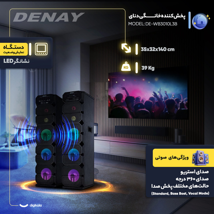پخشکننده خانگی دنای مدل DE-WB3010L3B یک سیستم صوتی ایستاده و فوقالعاده قدرتمند است که طراحی شده تا قلب تپنده هر مهمانی باشد. این دستگاه با ابعاد کلی ۳۵x۳۲x۱۴۰ سانتیمتر، بدنهای مستحکم از ترکیب چوب و پلاستیک دارد و با وزن کلی ۳۹ کیلوگرم، نشاندهنده قطعات داخلی قوی آن است. این مدل مجهز به نورپردازی RGB است که جلوهای رنگارنگ و پویا به فضای شما میبخشد. این سیستم با توان خروجی کلی ۵۰۰ وات، صدایی بسیار حجیم، استریو و ۳۶۰ درجه تولید میکند. ساختار صوتی آن شامل شش سابووفر ۱۰ اینچی، دو میدرنج ۴ اینچی و یک توییتر ۱ اینچی است که توازن کاملی بین فرکانسهای بم، میانی و زیر ایجاد میکند. دستگاه از حالتهای مختلف پخش صدا (مانند Bass Boost و Vocal Mode) پشتیبانی میکند. از نظر اتصالات، نسخهی بلوتوث ۵ اتصال سریع و پایدار را تضمین میکند. ورودیهای جک ۳.۵ میلیمتری صدا (AUX) و شیار کارت حافظه (SD) برای پخش مستقیم موسیقی در دسترس هستند. وجود ورودی میکروفون و قابلیت سازگاری با دستگاههای CD و DVD، این پخشکننده را به یک مرکز سرگرمی چندمنظوره تبدیل میکند. دستگاه دارای نمایشگر دیجیتال LED برای نمایش وضعیت پخش است. اقلام همراه این سیستم شامل ریموت کنترل، کابل برق، دفترچه راهنما و میکروفون است. این مدل از فرمتهای صوتی MP3، WMA و WAV پشتیبانی میکند و منبع انرژی آن برق شهری است.