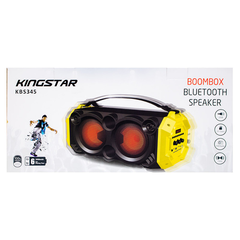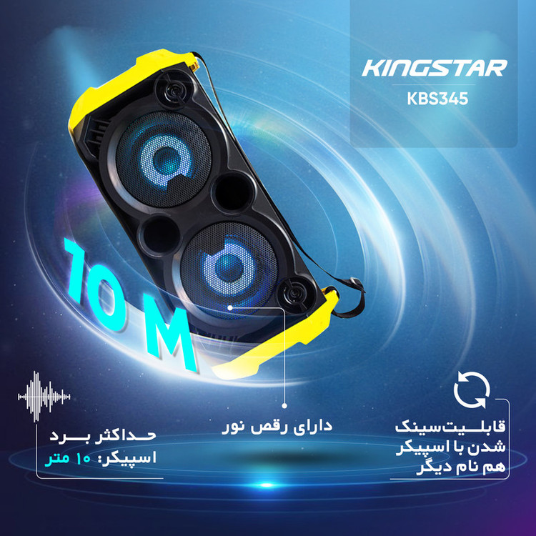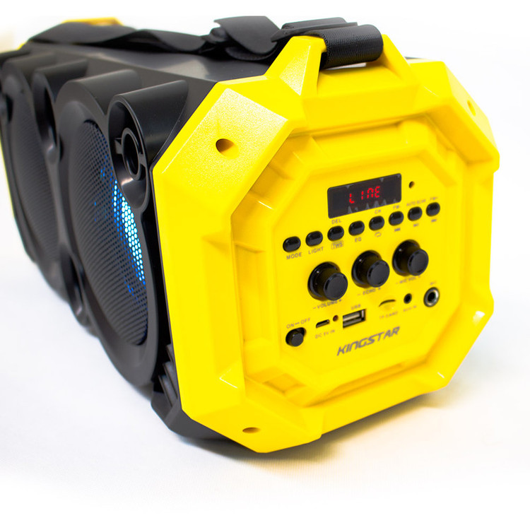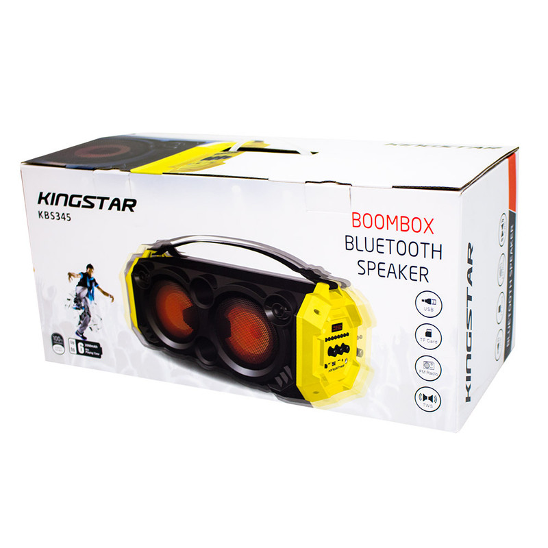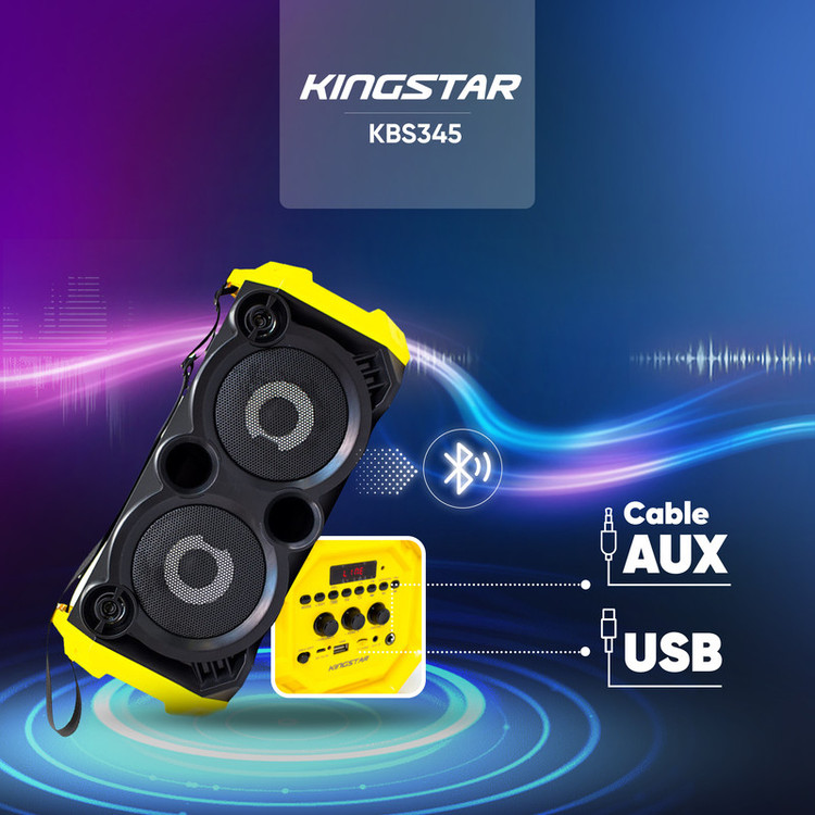 اسپیکر KBS345 کینگ استار محصولی با طراحی بسیار خاص و جذاب است. رنگ زرد به کار رفته در کنارههای این محصول نشاندهنده و انتقالدهنده انرژی است. این محصول علاوه بر طراحی و رنگ جذابش دارای قابلیت رقص نور نیز است. این اسپیکر دارای قابلیت بلوتوث بوده که میتوانید آن را با دستگاه خود همگام کنید. اگر طرفدار برنامههای رادیویی باشید یا در یک کمپ همراه دوستانتان بخواهید مسابقه فوتبال را از طریق رادیو دنبال کنید این اسپیکر پاسخگوی نیاز شما خواهد بود زیرا که از FM Radio پشتیبانی میکند. اگر نگران سختی حملونقل آن هستید، طراحان محصول به این قسمت نیز فکر کردهاند و با قرار دادن بندی آویز با استحکام و مقاومت بالا، حملونقل و انتقال محصول را آسان کردند. روی صفحه کنترل این اسپیکر یک صفحه LED کوچک قرار دارد، سه کلید چرخشی که هر یک برای تنظیم صدای اسپیکر، صدای میکروفون و میزان اکو استفاده میشوند و سوکت میکروفون نیز وجود دارد که میتوانید میکروفون خود را به آن متصل کنید و خروجی صدای آن را تنظیم کنید. پورت USB به شما امکان اتصال فلش مموری خود به دستگاه را میدهد و پورت TF آن شما را از یک دستگاه پلیر کارت حافظهدار بینیاز میکند.