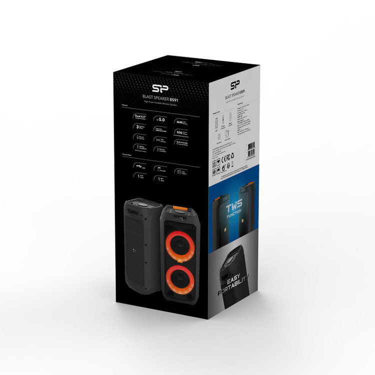 برند سیلیکون پاور که سالها است که به عنوان یکی از برترین تولیدکنندگان محصولات حافظه در دنیا فعالیت میکند توانسته است به تازگی یکی از کمپانیهای تولید کننده اسپیکرهای بلوتوثی در سایزهای کوچیک و متوسط و بزرگ را به سبد محصولاتش اضافه کند که یکی از بهترین و جدیدترین مدلها مدل BS93 را به بازار عرضه کرده است. اسپیکر BS93 با 40 وات RMS و سبکهای نورپردازی مناسب، میتواند موسیقیهای شما را در کیفیتی عالی، ارائه نماید. میتوانید نور را با ضربات موسیقی هماهنگ کنید تا فضایی زیبا همراه با صوتی دلنشین داشته باشید. این محصول زیبا از برند سیلیکون پاور دارای ساختاری مستحکم است که باعث میشود دوام و مقاومت بسیار خوبی در شرایط مختلف داشته باشد. این محصول دارای قابلیت اتصال با سیم و بی سیم است که اتصال بی سیم به وسیله بلوتوث و اتصال سیمی نیز به وسیله رابط 3.5 میلی متری AUX خواهد بود. همچنین سیلیکون پاور مجهز به میکروفون است. به راحتی میتوانید برای ایجاد سرگرمیهای خود و افزایش هیجان در میهمانیهای خود، از این اتصالات استفاده کرده و در موسیقیهای بی نظیر و شفاف آن، غوطه ور شوید. این اسپیکر 4500 میلی امپر ظرفیت باطری دارد مدت زمان استفاده با ولوم 50 درصد تا 6ساعت است. این اسپیکر دارای قدرت 700 واتی دارای میکروفن وایرلس با قدرت 20 متر دارای ریموت کنترل دارای قابلیت TWS که همزمان به دستگاه مدل خودش وصل میشود.