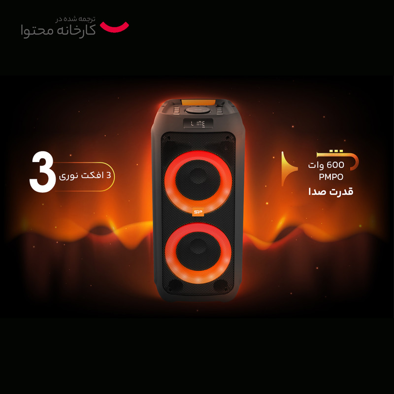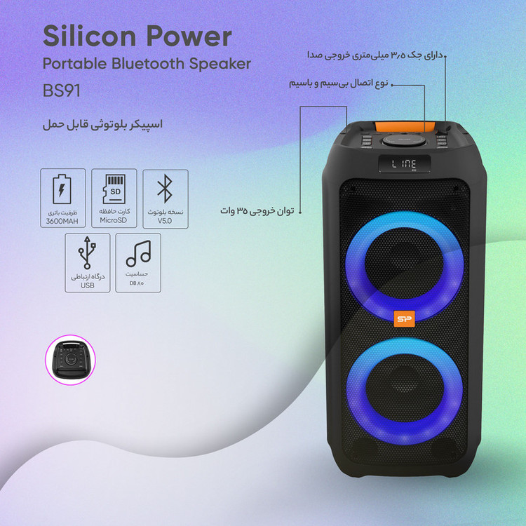 برند سیلیکون پاور که سالهاست بهعنوان یکی از برترین تولیدکنندگان محصولات حافظه در دنیا فعالیت میکند، توانسته است به تازگی اسپیکرهای بلوتوثی در سایزهای کوچک، متوسط و بزرگ را به سبد محصولاتش اضافه کند. یکی از بهترین و جدیدترین مدل اسپیکرهای این شرکت مدل BS91 است. اسپیکر BS91 با 35 وات RMS و سبکهای نورپردازی مناسب، میتواند موسیقیهای شما را در کیفیتی عالی ارائه نماید. شما میتوانید در این اسپیکر، نور را با ضربات موسیقی هماهنگ کنید تا فضایی زیبا همراه با صوتی دلنشین داشته باشید. این محصول زیبا از برند سیلیکون پاور دارای ساختاری مستحکم است که باعث میشود دوام و مقاومت بسیار خوبی در شرایط مختلف داشته باشد. این دستگاه دارای قابلیت اتصال باسیم و بیسیم است که اتصال بیسیم بهوسیله بلوتوث و اتصال سیمی نیز بهوسیله رابط 3.5 میلیمتری AUX خواهد بود. همچنین این دستگاه برند سیلیکون پاور مجهز به میکروفون است. شما بهراحتی میتوانید برای ایجاد سرگرمیهای خود و افزایش هیجان در میهمانیها، از این اتصالات استفاده کرده و در موسیقیهای بینظیر و شفاف آن غوطهور شوید. این اسپیکر 3600 میلیآمپر ظرفیت باطری دارد؛ مدت زمان استفاده با ولوم 50 درصد تا 5 ساعت است. این اسپیکر دارای قدرت 600 واتی، دارای میکروفن وایرلس باقدرت 20 متر، دارای ریموت کنترل، دارای قابلیت TWS که همزمان به دستگاه مدل خودش وصل میشود و دارای خروجی USB، میکرو و AUX نیز است.