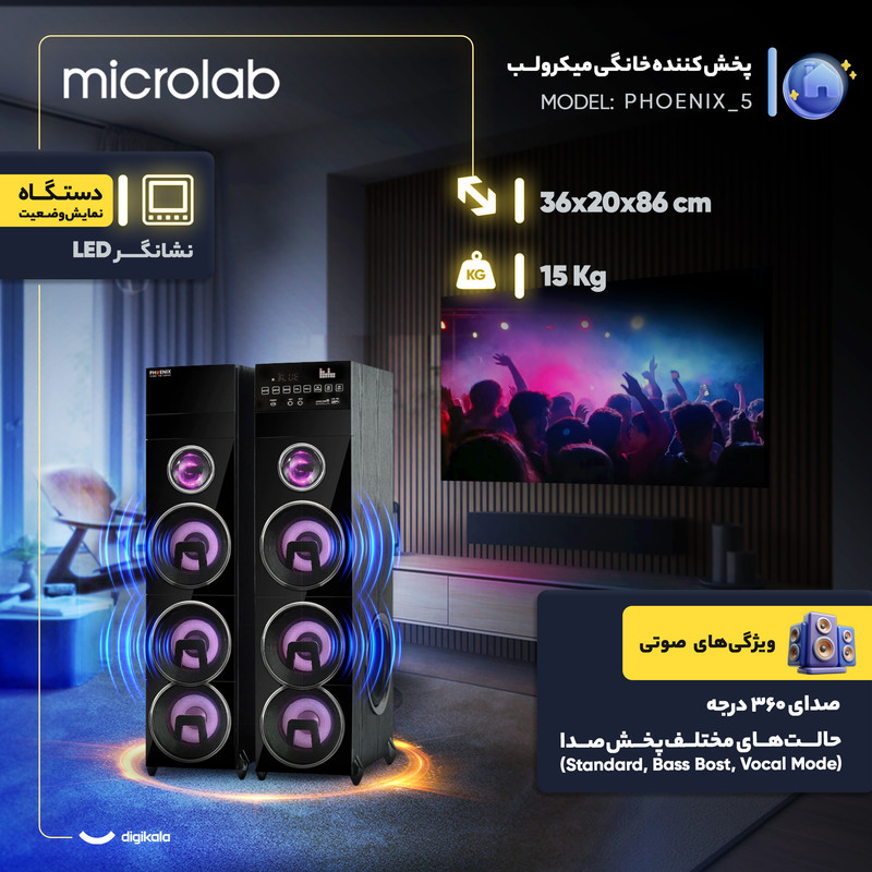 پخشکنندهی خانگی «میکرولب» (microlab) مدل «فونیکس» اسپیکری خوشساخت و حرفهای از این برند است که تمامی امکانات یک پخشکنندهی خانگی را ارائه میکند. این سیستم صوتی از بدنهای از جنس چوب 16 میل ساخته شده است که ارتفاع هرکدام از اسپیکرهایش به 83 سانتیمتر میرسد. در قامت هرکدام از این یونیتها، ساب ووفرهای 8اینچی و میدرنج های 6.5 اینچی که با کیفیت مطلوبی ساخته شدهاند، تعبیه شده است. دکمه ها و کنترل های پنل این محصول به صورت تاچ طراحی و اجرا شده اند این امر باعث میشود بتوانید با راحتی بیشتری از این سیستم استفاده کنید. این سیستم صوتی، درگاه USB با قابلیت پخش فایل های تصویری تا فرمت HD است که برای کاربران امکان اتصال فلشمموری را فراهم میکند؛ همچنین میتوانید کارت حافظهی SD خود را به این دستگاه متصل کنید. ، برای آن دو عدد ورودی میکروفون در نظر گرفته شده است تا براحتی میکروفون خود را به دستگاه متصل کنید. این پخشکننده دارای یونیتهایی خوشساخت با دوام و مقاومت بالاست تا کاربرانش را تا مدتزمان بیشتری همراهی کند. طراحی جذاب نمایشگر بزرگ و نودر صورت نیاز، صدای خود را از اسپیکرها پخش کنید. برای این مدل اتصال بیسیم بلوتوث در نظر گرفته شده است. میتوانید با استفاده از آن، فایلهای صوتی خود را از موبایلرهای الایدی محو ، دکمههای لمسی با مقایسهی این مدل با سایر محصولات صوتی حرفهای؛ همچنین همراه این اسپیکر، یک عدد میکروفون بیسیم ارائه میشود تا بتوانید یا پخشکنندههای موسیقی دیگر بدون اتصال کابل به این اسپیکرها منتقل کنید.همچنین با اتصال به اپلیکیشن BT LINK در این محصول لذت گوش دادن به موسیقی برای شما چند برابر شده و ضمن مدیریت تمام اجزای صدا می توانید برای اولین بار رنگ نور زمینه اسپیکر را با محیط پیرامون خود هماهنگ نمایید.